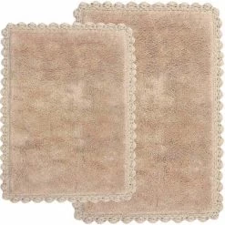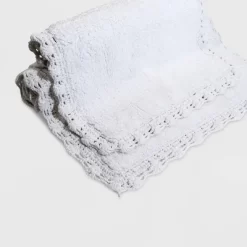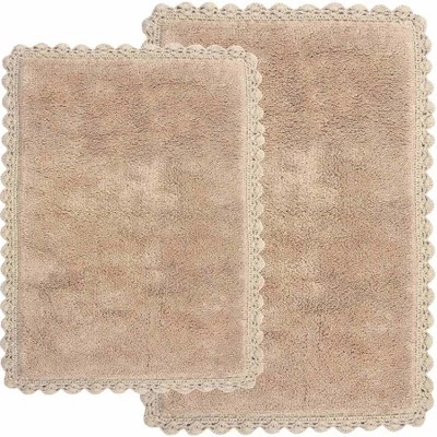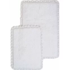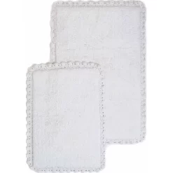 Create a look reminiscent of a French Country retreat in your bathroom with this set of two bath rugs in three classic, subdued colors. We designed this traditional style bath rug set to bring a higher level of warmth and comfort to your bathroom decor. The handmade crochet edging detail in this white bath rug set gives an elegant design to complement distressed wood, crystal lighting and floral details for the perfect Provence powder room. Pair with vintage accessories for an effortless shabby chic feel.