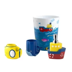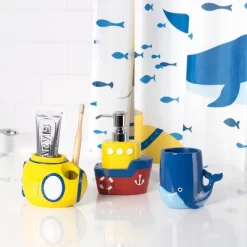 Make every day bath time a fun and thrilling adventure for your little ocean explorer with the Submarine 3-Piece Bath Accessory Set by Allure Home Creation. The set includes a Lotion Pump with a Plastic Chrome Finish Pump Head, Toothbrush Holder and Tumbler. Each piece of this nautical-sea life themed collection is creatively shaped and made of durable resin in bright multi colors. This seafaring design is sure to spark your little sailor’s imagination and make their bath time routine more fun. Hand Wash, Spot or Wipe Clean. Complete the look with the coordinating Submarine Shower Curtain and Wastebasket.