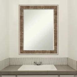 Give your bathroom the finishing touch with this 100% real wood Petite Bevel bathroom mirror. The Farmhouse Brown Narrow frame is a rustic frame with an authentic, weathered paint look and distinct distressing. The finish is warm brown wood with cream-colored wash.. The frame is 2.75 in. wide and stands 1 in. off the wall. It’s Individually made using traditional custom framing techniques, it has the quality you expect from your local frame shop. It holds its value with premium finishing that can be appreciated up close. Because of our attention to detail and focus on artistry, architects, interior designers, and homeowners alike choose this mirror to create beautiful living spaces.