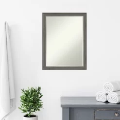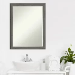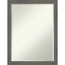 Give your bathroom the finishing touch with this 100% real wood Petite Bevel bathroom mirror. The Regis Barnwood Grey Narrow frame is a grey-washed, distressed frame, with distinctive weathering and a higher outer edge.. The frame is 1.5 in. wide and stands 1 in. off the wall. It’s Individually made using traditional custom framing techniques, it has the quality you expect from your local frame shop. It holds its value with premium finishing that can be appreciated up close. Because of our attention to detail and focus on artistry, architects, interior designers, and homeowners alike choose this mirror to create beautiful living spaces.