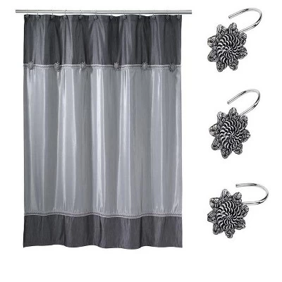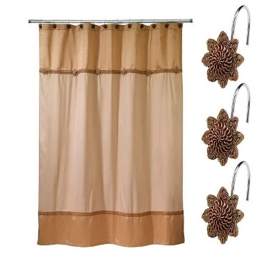 The Avanti Braided Medallion Gold 13-Piece Shower Curtain/Shower Hook Set features a fabric shower curtain with gold panels top and bottom separated by a beige center and coordinating braids and medallions. The shower hook is a recreation of the medallion in hand painted resin. Set includes one 72″ x 72″ 100% polyester shower curtain and 12 durable resin shower hooks. Imported.