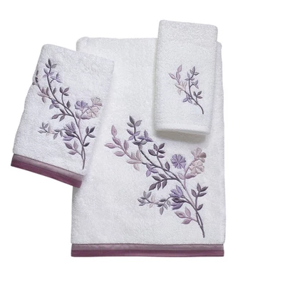 The Avanti Whisper 3-Piece Decorative Towel Set is a beautifully embroidered floral in shades of purple, lilac and plum with coordinating two-tone fabric border on the bath and hand sizes. 100% cotton (exclusive of embellishment) white terry towel. Set includes one each bath, hand and fingertip towel. Imported.