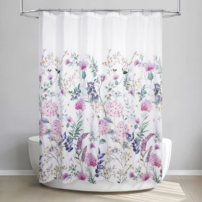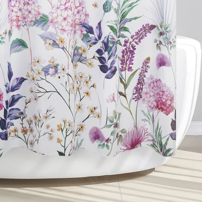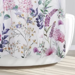 Bring the beauty of the outdoors indoors with the Bloomstruck Shower Curtain by Allure Home Creation. This lovely floral design captures natures abundance featuring a garden of multi-colored blooms reaching towards the sun on a white ground. This romantic floral design will bring a breath of fresh air to your bathroom. This printed shower curtain measures 70″ x 72″ and fits most standard sized tubs and shower areas providing privacy and protection from water splashing onto the floor. Crafted from 100% easy care microfiber polyester fabric with a reinforced buttonhole top that works well with standard shower hooks and curtain rods. Use of a liner is recommended. Machine wash cold on gentle cycle and tumble dry on low heat.