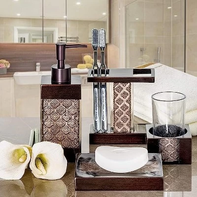 - Striking Décor: With With An Enchanting Mix Of Eye-catching Brown Color & Lovely Dahlia Texture, The Bathroom Soap Dispenser Set Complements Any Modern Bathroom And Will Definitely Wow Your Guests, These Bathroom Sets Decorate Any Space!