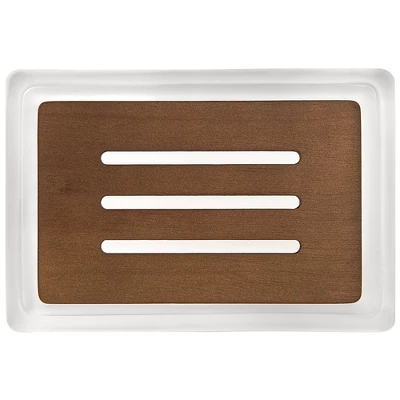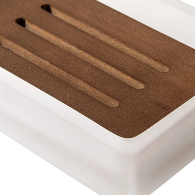 - Sophisticated contemporary frosted glass soap dish with wood accents brings a warm, rustic feeling to your room
