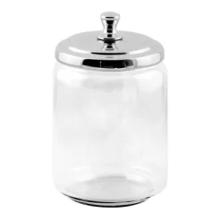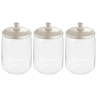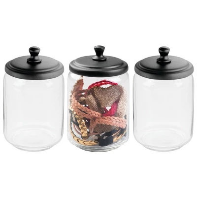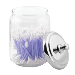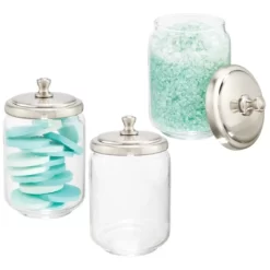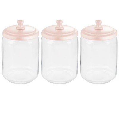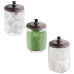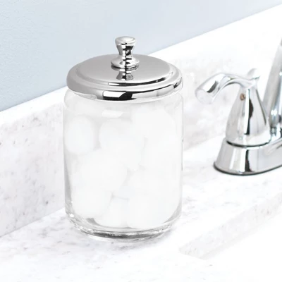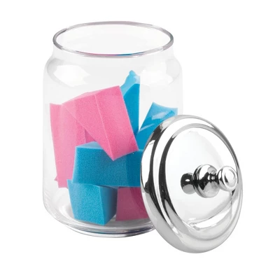 This mDesign Vanity Cosmetic Canister Jar with lid is great for keeping cosmetics and other daily essentials organized on your bathroom vanity or a dresser top. Use these round jars for everything from cotton balls and cotton swabs to cosmetic wedges, makeup swabs, bath salts, bath bombs, small soaps and more. The classic styling and decorative lids add a touch of class anywhere they are used.