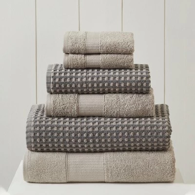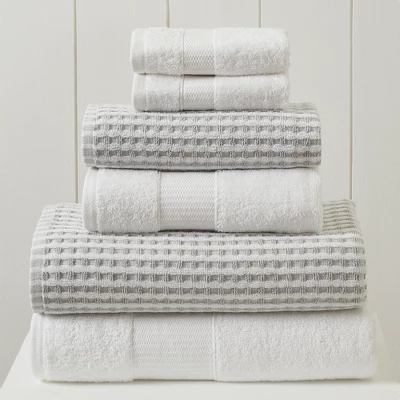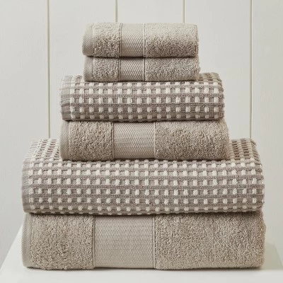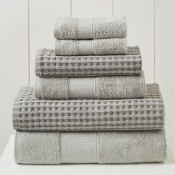 With the popularity of waffle fabrics and weaves, this towel set was inspired by the casual subtleties of easy living. A beautiful textured jacquard design with two tone appeal will enhance any bathroom. Soft tonal combinations in the jacquard towels are paired with a solid terry coordinate towel set for the perfect look. The solid towels have a simple dotted ticking stripe dobby that mimics the jacquard design in a smaller scale for great balance. Absorbent and wonderfully soft, your guests will want to take these home with them.