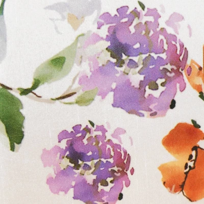 - Allover cascading floral design printed on 100% polyester faux silk in vibrant multi colors on a crisp white ground