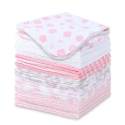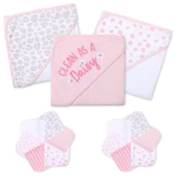 The Peanutshell baby bath towel and washcloth set is the most complete towel set you will ever need! Bath time with your baby girl will be sudsy fun with this 23 piece baby bath set. The pink floral and cheetah design will make bath time into the most fun time with your little one. The baby towels in this set come with adorable hoods to wrap up your baby and simultaneously help them to dry quickly. If you have a baby shower to attend, don’t fret about the gift! This hooded baby shower gift set is a perfect and practical baby gift for newborn boys and girls alike. The set includes 3 large hooded towels (30 x 26) and 20 washcloths (9 x 9), each in super-soft printed and solid terry cloth. All towels in the set are made of a 80% Cotton and 20% Polyester blend which makes these soft for baby’s skin yet easy care.