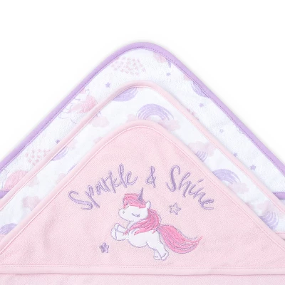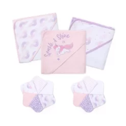 Your little girl will sparkle and shine during bath time with the 23 Piece Unicorn Rainbow Baby Bath Towel Set from The Peanutshell. Our convenient bundle of bath essentials features 3 generously sized hooded towels – 2 printed patterns and 1 with an embroidered Unicorn. It also includes 4 solid pink, 4 solid white, and 12 washcloths in 4 fun prints. Our light pink, white and purple unicorn and rainbow designs are printed on super soft and absorbent toweling to ensure baby stays warm, dry, clean, and cozy. These must-have bath accessories make a great gift set for new parents!
