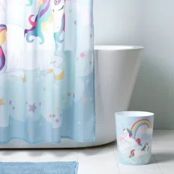 Add a magical touch to your little one’s bathroom with the Unicorn and Rainbow Shower Curtain by Allure Home Creation. This enchanting design, in colorful shades of the rainbow, features mythical unicorns gently floating on puffy clouds of white and pink. The star filled sky blue backdrop is highlighted with a brillianr curved rainbow. This fairy-tale design is sure to spark your child’s imagination and make their bath time routine more fun. This printed shower curtain measures 70″ x 72″ and fits most standard sized tubs and shower areas providing privacy and protection from water splashing onto the floor. Crafted from 100% easy care polyester taffeta fabric with a reinforced buttonhole top that works well with standard shower hooks and curtain rods. Use of a liner is recommended. Machine wash and tumble dry on low heat. Complete the look with the coordinating Unicorn and Rainbow Bath Accessories.